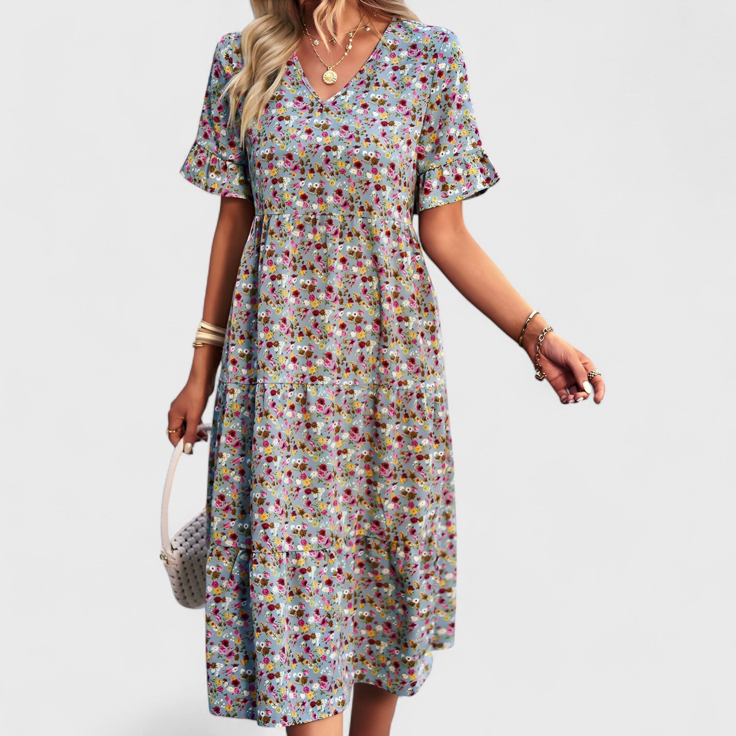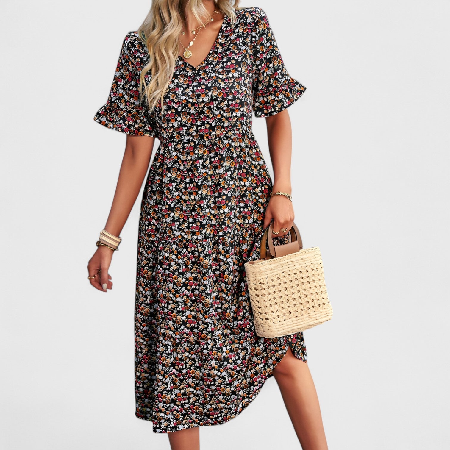 Verzaubern Sie Ihre Umgebung mit unserem atemberaubenden Blumenkleid, das feminine Eleganz und modernen Stil perfekt vereint. Das hochwertige Material umschmeichelt Ihre Silhouette auf besonders angenehme Weise, während das zeitlose Blumenmuster Sie zum strahlenden Mittelpunkt jeder Veranstaltung macht.